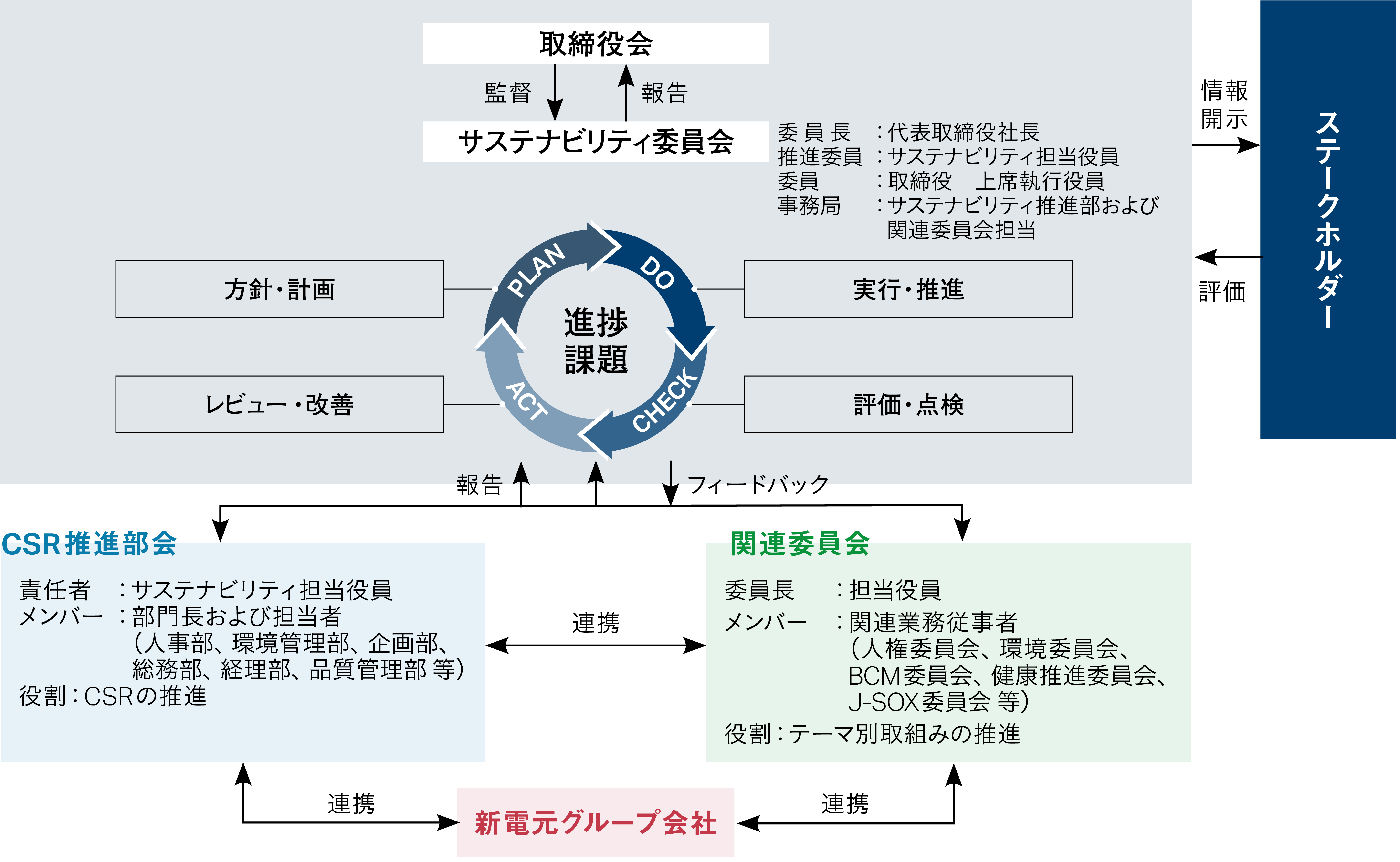 - 役割:サステナビリティに関する全社方針の策定、進捗状況のレビュー、各関連委員会の活動統括