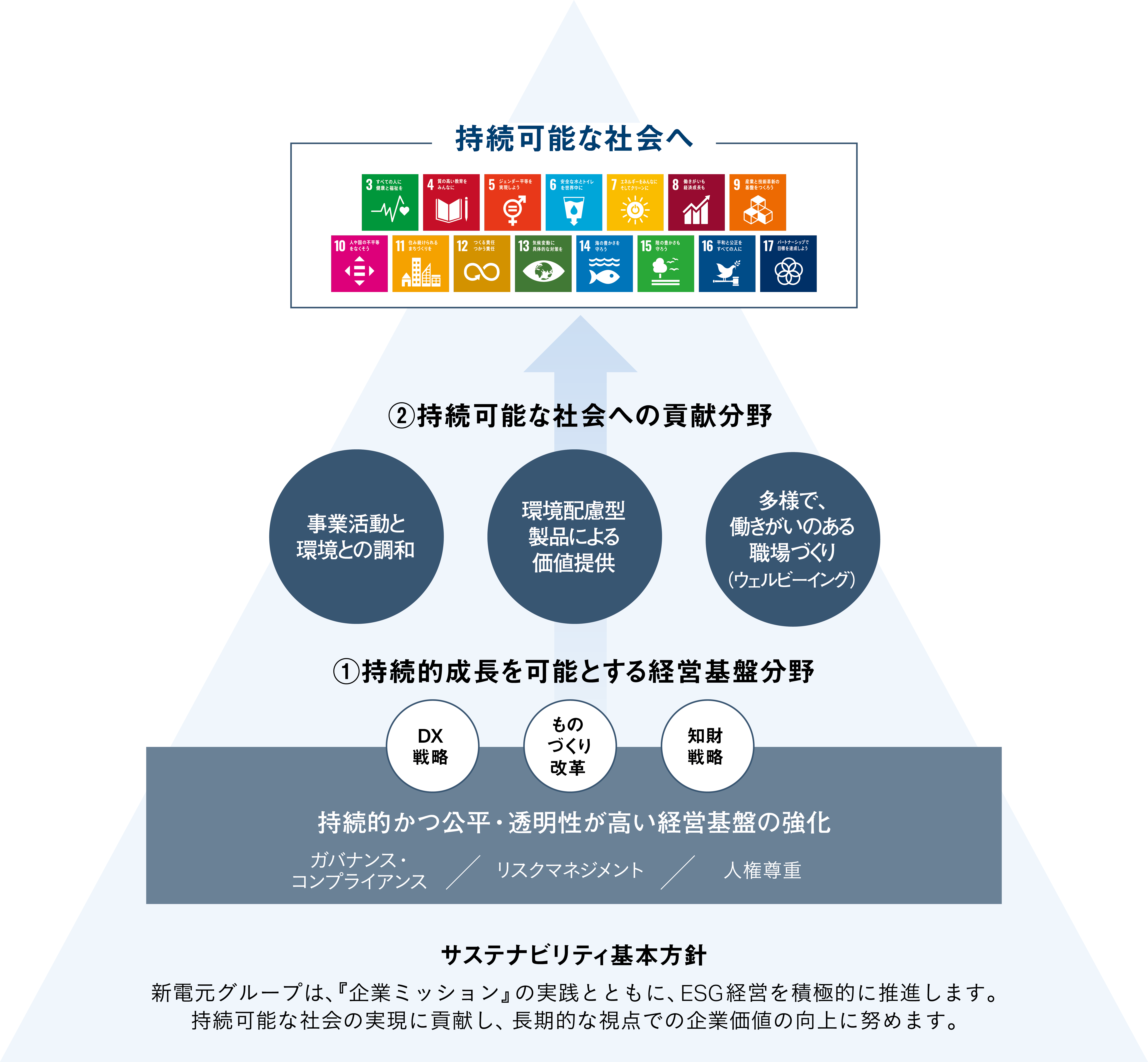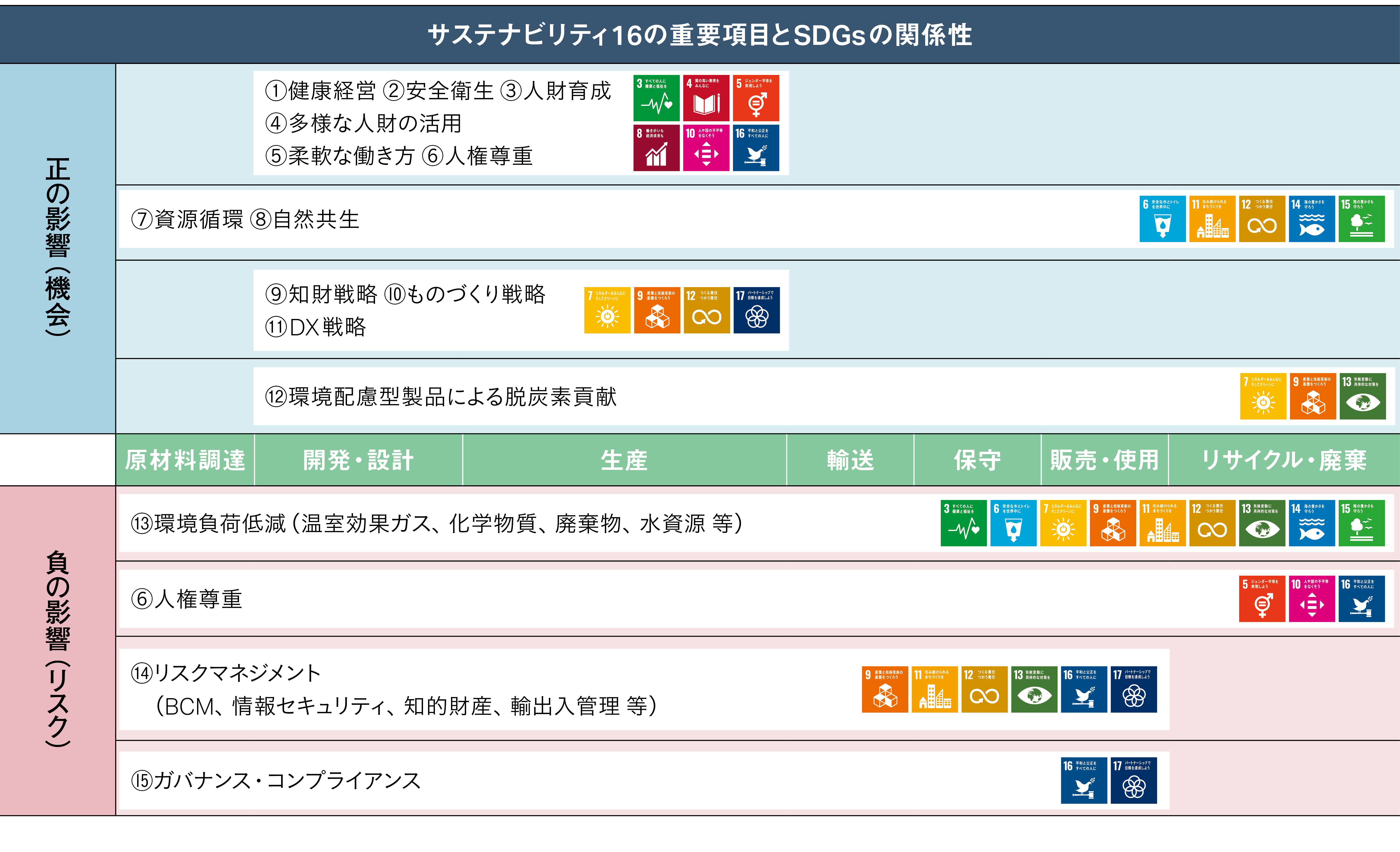 新電元グループでは、全社レベルでサステナビリティへの16の取組みを推進し、経営における重要なリスクの低減・回避を図るとともに、事業機会の拡大を通じて企業価値の向上に努めています。