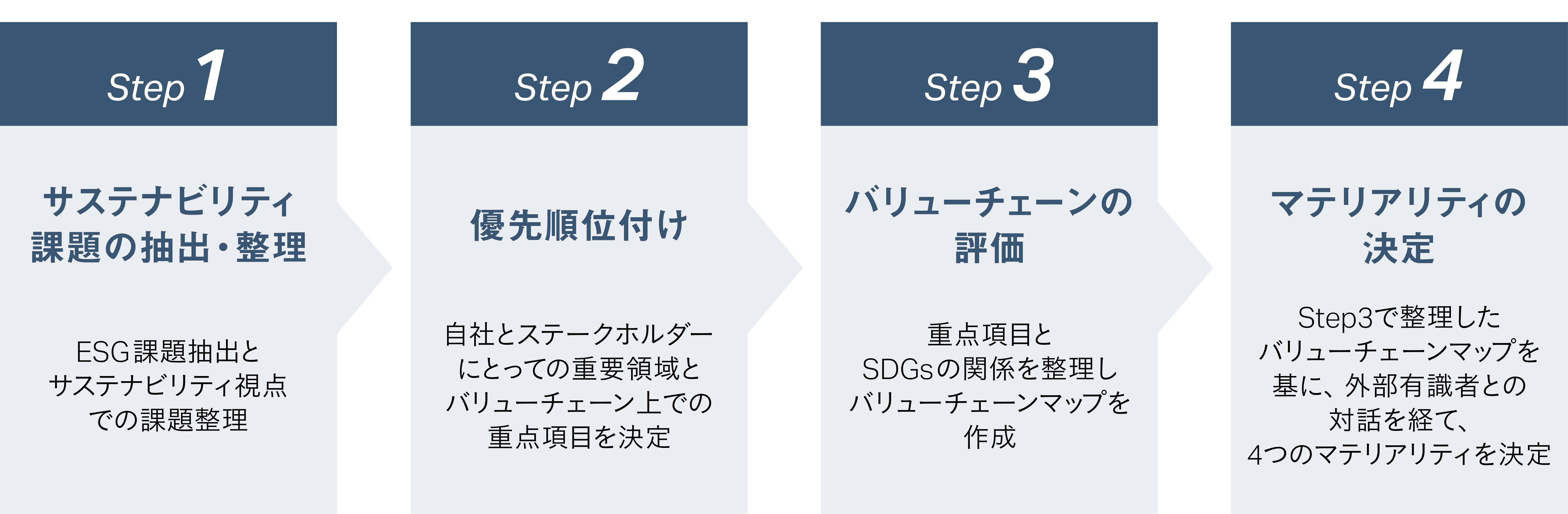 当社グループでは、マテリアリティ(重要課題)の特定にあたり、以下のプロセスを経て選定を行い、サステナビリティ委員会の承認を得た上で決定しています。