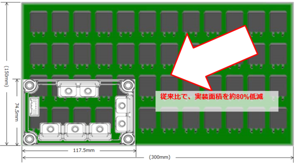 また、従来ディスクリート半導体を採用していた際に必須であった絶縁処理が不要となる上、本パワーモジュール専用に開発された素子(ベアダイ)と高放熱化パッケージを採用することで、大電力容量を確保しながら小型化を実現しています。