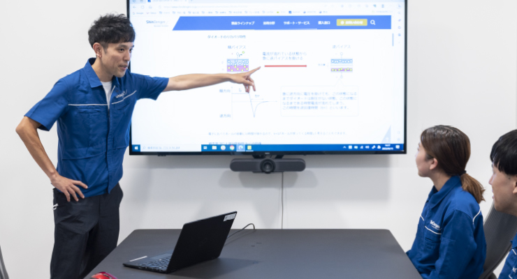 一番印象に残っていることは、入社3年目にダイオード製品の新規開発に取り組んだことです。シミュレーションから始まり、試作・評価・課題改善・客先PR・量産化といった一連の業務を担当しました。特に苦労したのは、試作時に狙い通りの特性が出なかったことです。試行錯誤を繰り返すも思うようにいかず、納期に追われる日々でした。当時は非常に苦しい思いをしましたが、そんな時も上司や先輩は温かく見守ってくれ、焦るような言葉をかけることは決してありませんでした。周囲のサポートもあり、納期通りにエアコンメーカーのお客様へ納品出来ました。若手から裁量・責任感のある仕事を経験し、失敗を重ねても最後までやり遂げることが出来たのは、今でも感謝していますし、大きな成長に繋がったと思います。私自身、後輩指導の際に心掛けるようにしています。失敗しても臆せずチャレンジできる環境は、当社の良き伝統だと思います。